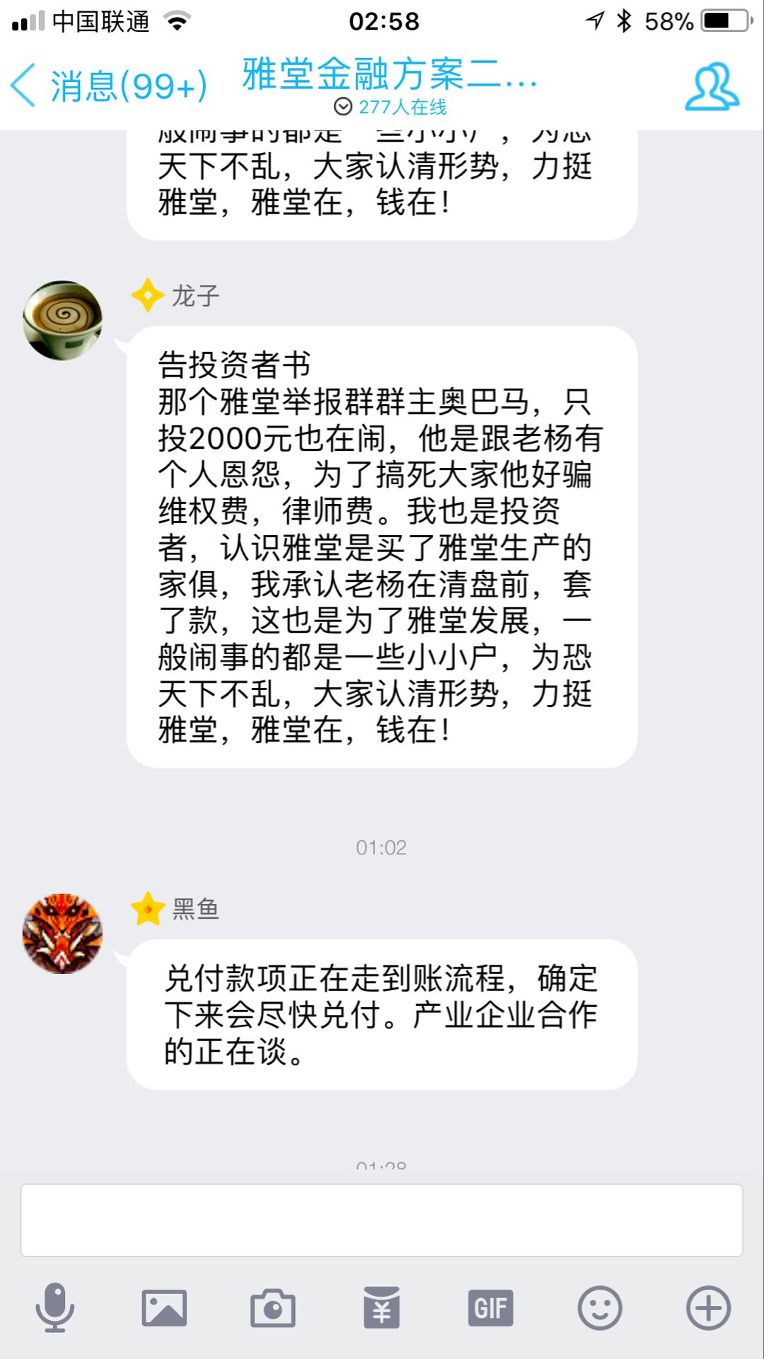 我说这些也没用了,我只是想表明,他们说啥我都不信了。。我不到160,体重不到100斤,一个警察提3个我这样的小女子,都轻轻松松。。雅堂想活有难度,前期产业扩张太快,老杨把小超这个项目想的太美好,实体最重要是口碑,我已经死心了。。连当初从他那里、获利最多的两位亲密部下,苹果和考拉,都不出钱帮他,还指望其它人帮吗 — 雅堂金融(资金盘) — 2018.3.14-8:33