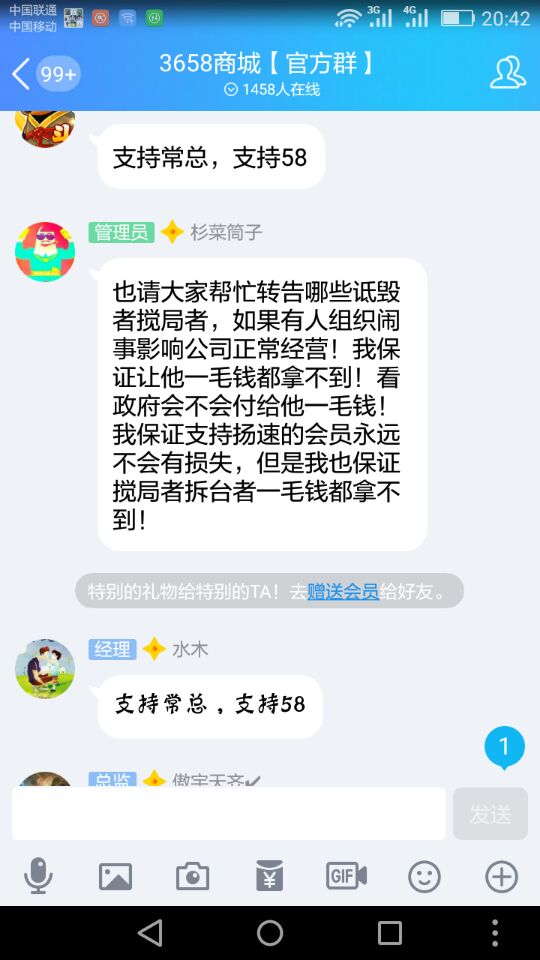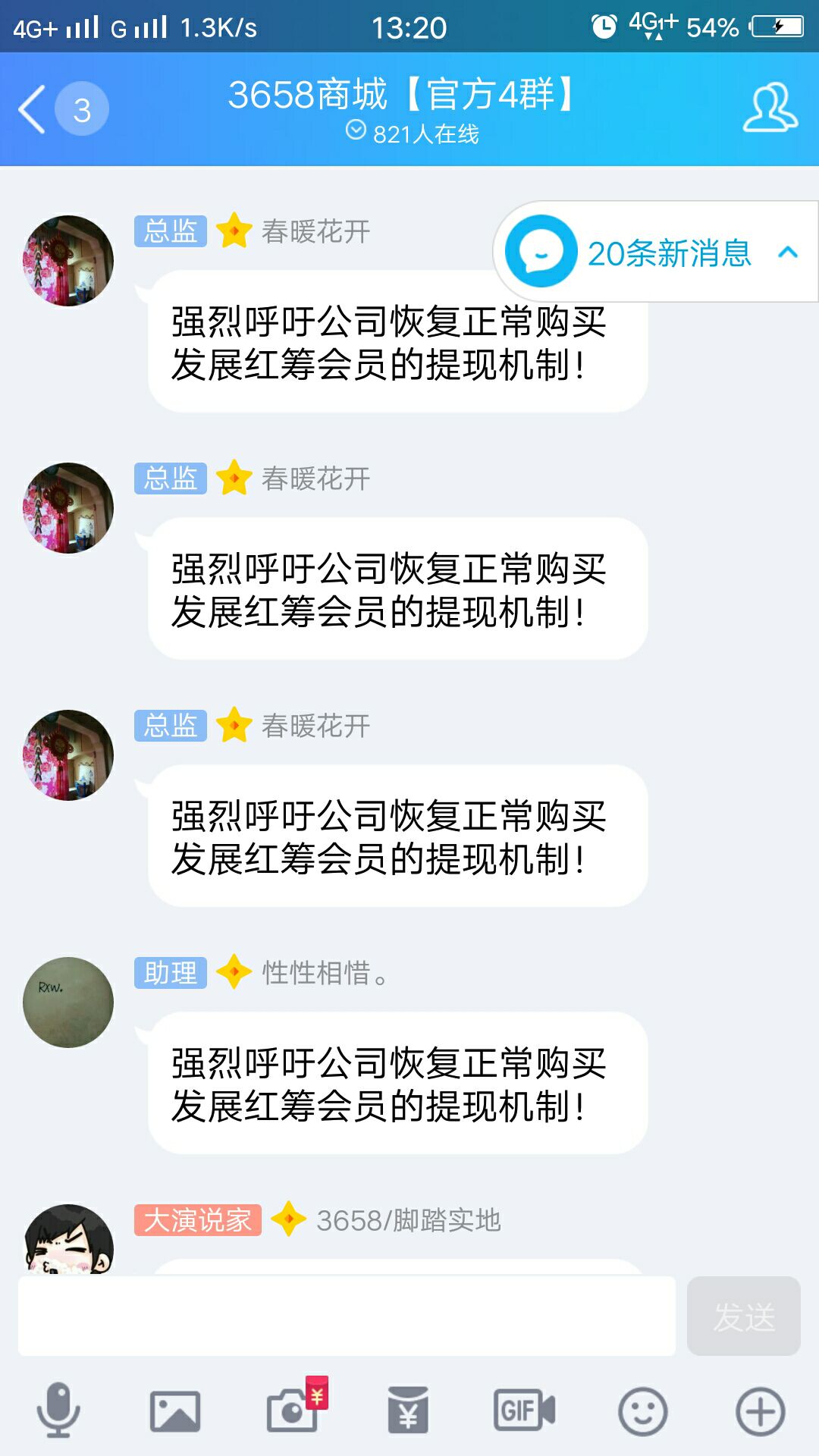 肛肠一边说不需要新人,一边不停的叫大家去传销拉下线······所有措施全部失败,说明58这个盘盘不活了,只能推到,用58剩的池子弄个进钱······慢慢提现,一段时间满盘皆活!天天抱怨,自毁长城,统统耗死!不要私聊我你有多么困难!那个喊不能提现的,请睁大你的眼睛看清楚!哪里写着不能提现的!你想不能提现也很简单,自毁长城使劲攻击,等到我的员工被你这样的人骚扰恐吓到离职的时候就是你一毛钱都拿不到的时候······3658商城(资金盘) 2018.3.23-20:43
