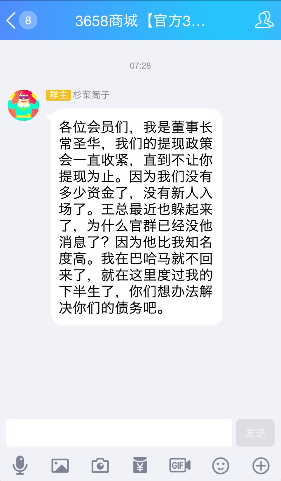 黑子无处不在······有进有出盘子才活,只进不出或者只出不进就会死······官群的简子一点点胸怀都没有 我们是占在自己角度考虑问题,58是站在全体会员考虑······算了吧,难道你站在对方看问题······所以越是怕挤兑越挤兑,越不开放提现越提现,大家的想法钱能出来没怎么用多余的钱还会存进去······3658商城(资金盘) 2018.3.25-1:16