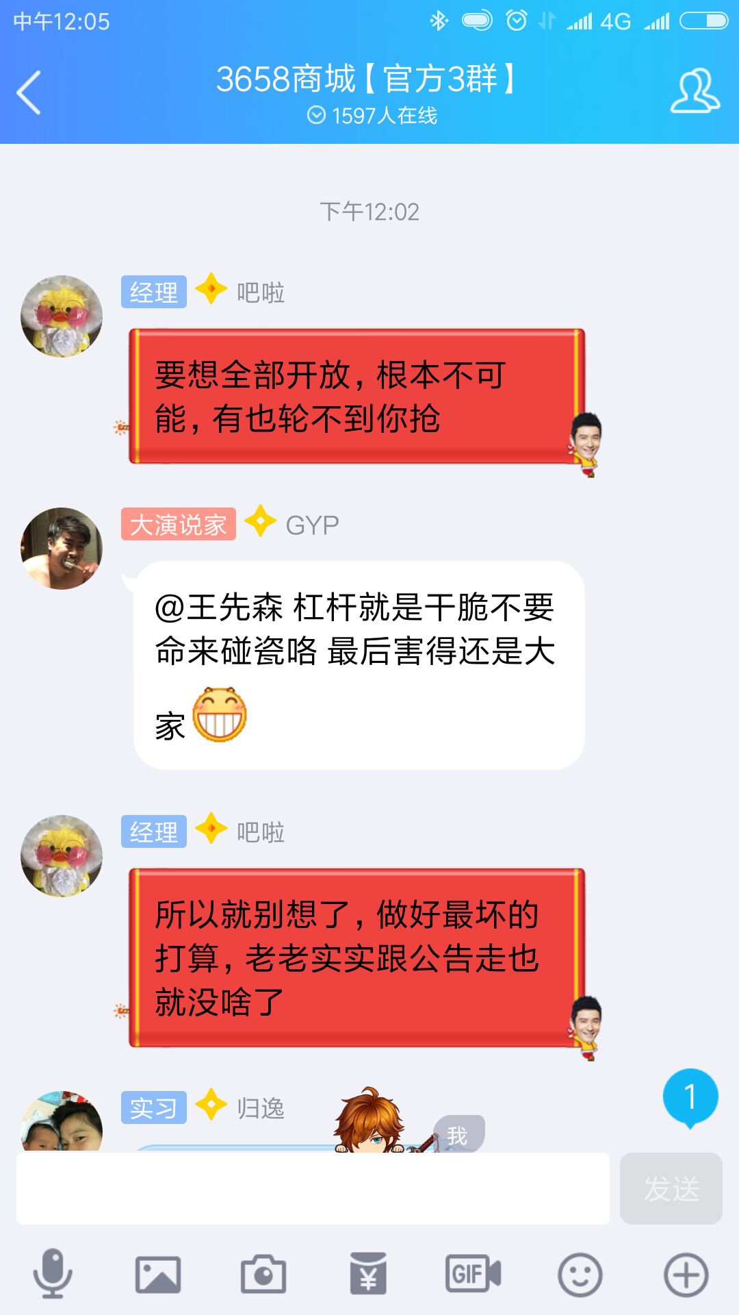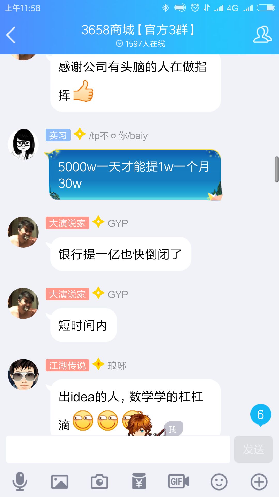 这一次直接冻死了······赶紧倒闭吧,像钱宝挖宝起码没念想,平台这样苟活着提不到钱······其实每周百分之二再提俩月绝对有人进来······就看不上哪些说能继续就好,还让和哪些跑路的平台比,怎么好意思,怎么不和好的比,天天和死掉的比有意思,那我活着是不是更好,比秦始皇都好······说玩杠杆的,贷款的,不要命碰瓷······我即使中了500万都不投,如果我朋友投我会给他说说最近发生的事,他愿意投就投不愿意就不投,绝不坑朋友,穷不坑朋友,富不忘恩······3658商城(资金盘) 2018.3.27-13:27