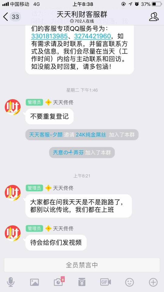 专门收留被各个群踢出来的投友······我每天都害怕天天跑路······就看到一个人在上班,她们还拍视频······现在大家是比惨,比狠,比手段模式,这样的局面是多输······具体情况云里雾里的,都快把投友逼疯了······天天利财 2018.3.29-10:43