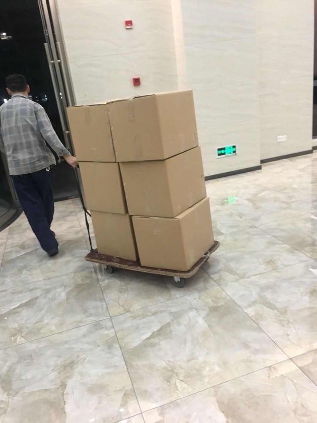 记者同时看到,在善林金融所在办公大楼的楼下停有两辆黄色卡车,至少五名工人在用推车把不少封好的打包纸箱,一次一次地从大楼内经电梯运到大楼门口的卡车上装运,而这些打包纸箱正是从善林金融的办公场所内运出。