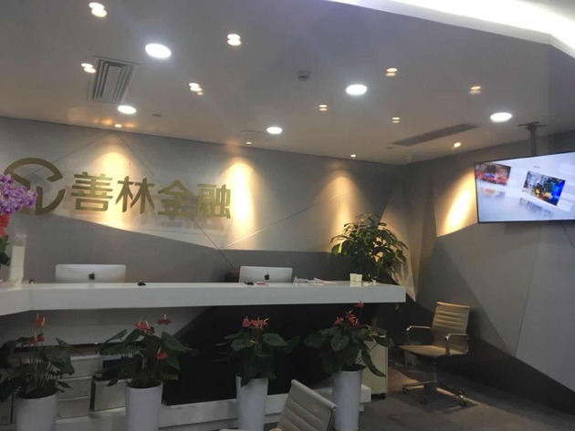由于善林金融办公地大门不宽、正对着前台,从门外无法观察到更多办公区域内情形,也并未见到大门被贴有封条等。记者到达时,还可以从门外看到,七楼前台一侧墙上挂着的一台显示屏仍在不断播放善林金融的宣传片。