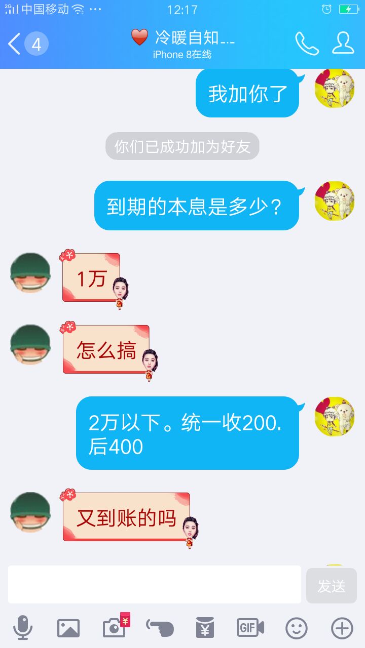 办下来很多台子了,每个台子名额有限······一般承诺转介绍的。等10天到账就没名额了。就这一个姨的到账快,她转介的······滚吧,我够了。我跑腿,我花钱,我出力,到头来白忙活。说我去办事的人,没诚意。什么脑子······你这个,要是信我,20万给你分两次报。第一次少报。处理到了。你再交后面多的部分······我们3天交一次,有多少报多少。5月就任何台都不接了······财佰通 2018.4.11-19:54