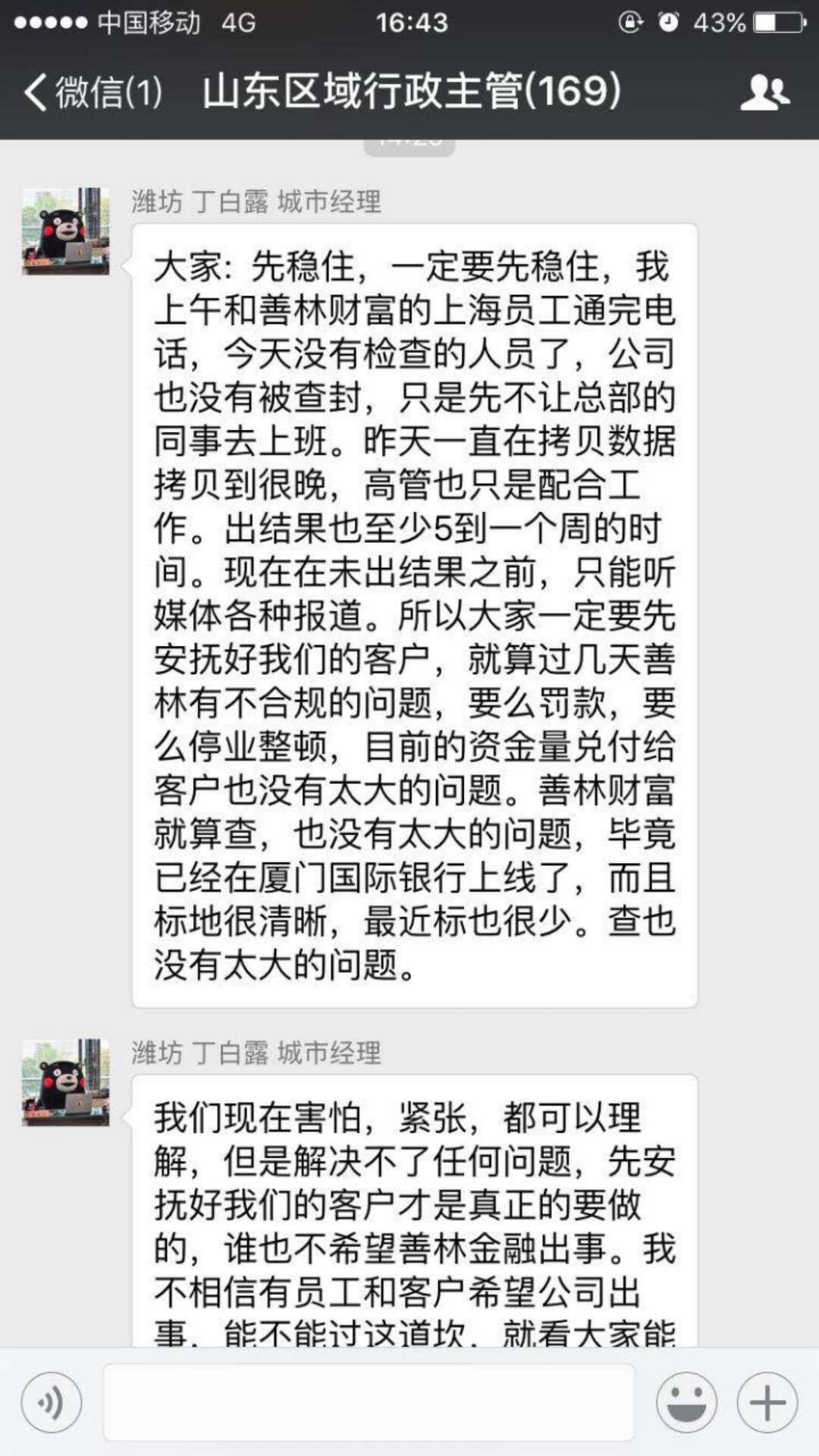 总部那边不恢复正常,其他分店再正常也没用······现在最大问题就是总部那边的人被停业了······我知道现在的传闻很多,我作为你们的对接人,我把我知道的都告诉你们······善林金融 2018.4.11-23:11