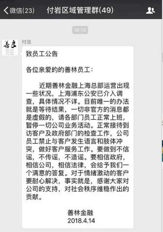 宜兴110万(五)······我200万啊······妈的就天天瞎起哄,知道什么······你们真的相信周老头是自首的吗,自首能不交代?能那么多天不定性,因为周老头是去备案的时候被控制起来了,然后才有自首一说,周老头在我门投资者眼里还是比较实干的······因为善林系公司非常复杂,有些公司,资产依然未冻结,及时报警申请资产保全,减少资产被转移走的可能性······善林金融 2018.4.14-22:32