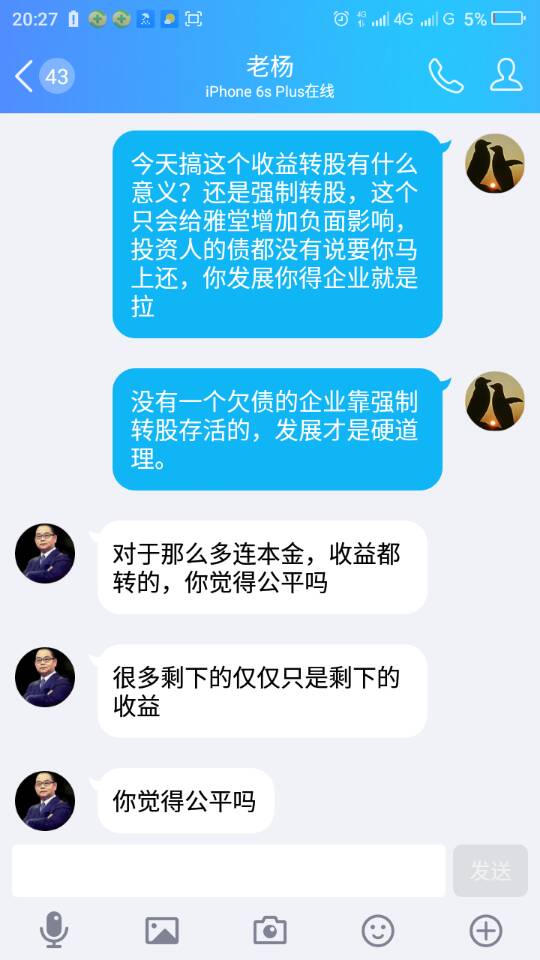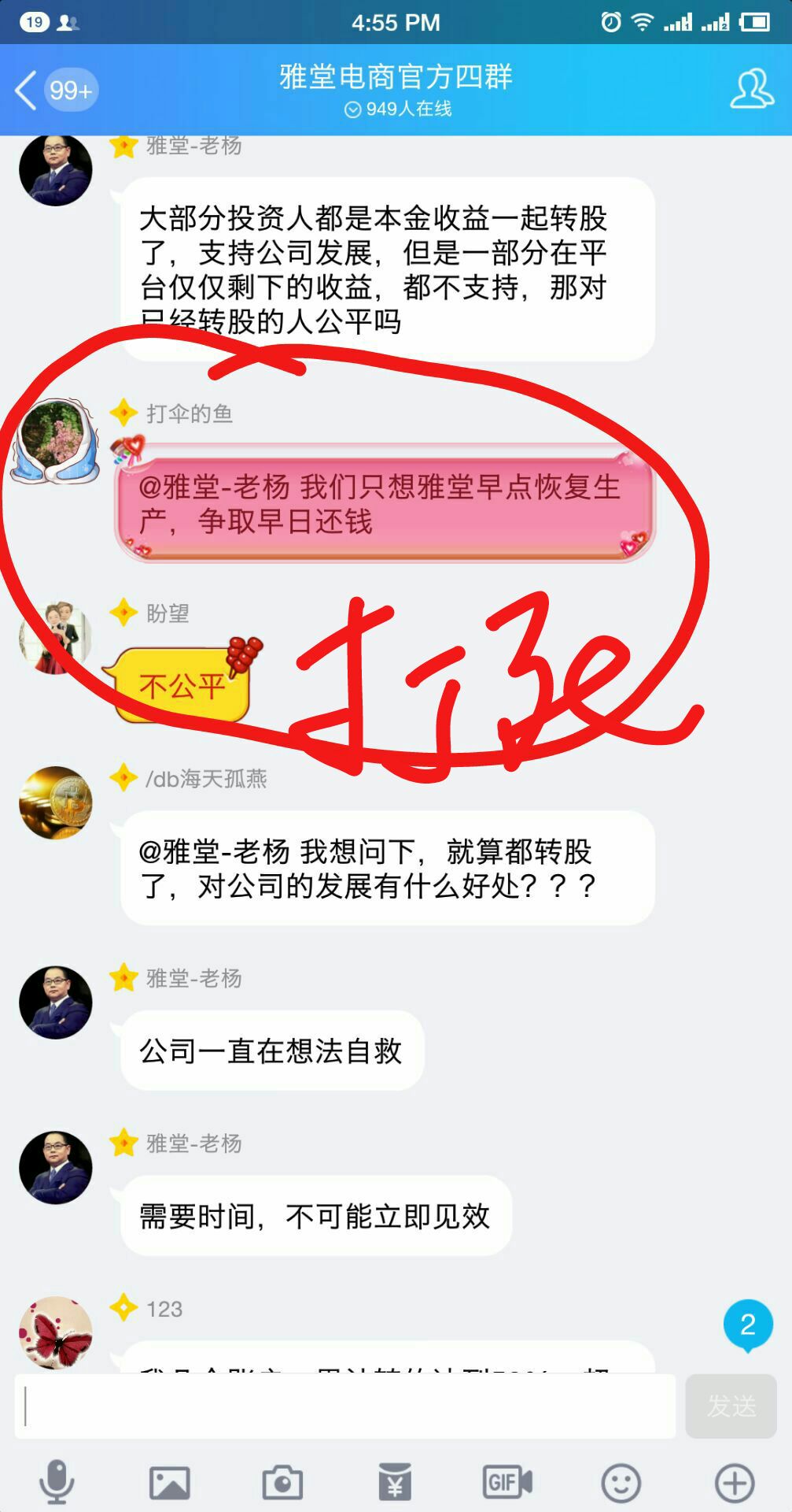 我很少说话,只是每晚进群看看有什么消息,今天看到这种混蛋通告下竟然还有水军在鼓噪,就说了一万余投资人的情况下,杨仅凭近千人的意见就可以决定转股事宜,有什么可让人信任的?还有走狗在这儿忽悠!结果被踢了。
