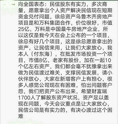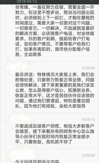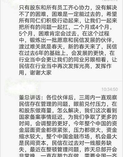 楼主这些是哪里来的,一直在别的帖子下面怂恿大家报警什么的,现在还发了他们家什么的会议内容,是真还在假的,我们只是想平台早点还我们钱,事情弄大了对我们投资者一点好处都没有。我不知道是不是你个人跟民信贷有仇还是什么的,不要拉我们下水。