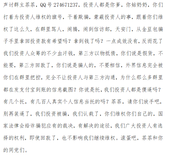 声讨群主茶茶,QQ号27—37,投资人都是你爹,你姑奶奶,你们打着为投资人维权的旗号,干着欺骗,蒙蔽投资人的事,跟着你们维权了这么久,在群里骂人,闹腾,闹到信访部,–门,从金豆包骗子手里拿回投资款有希望吗?拿到钱了吗?一点成效没有,反而花了我们投资人众筹的不少血汗钱,第三方以物抵债,你们说是假货,不能要,第三方回款了,你们说是骗人的,不要相信,外界信息完全被你们在群里把控,完全不让投资人与第三方沟通,为什么那么多群里都在发支付宝到账的信息截图?你说是托,我们投资人都是傻逼吗?有几个托,有几百人真实个人信息当托的吗?茶茶,请你们放手吧,别再装逼了,我们投资被骗,我们认栽了,你们维权你们自己的,国家法律会给诈骗犯应有的裁决,有解决的途径,我们广大投资人有选择的权利,即使回款了,也不影响我们继续维权。最可恶的是茶茶本人已经回款了,却造谣说大唐40%收购,并拿出自己自导自演的QQ截图愚弄投资人,滚蛋吧,茶茶和你的同党们。