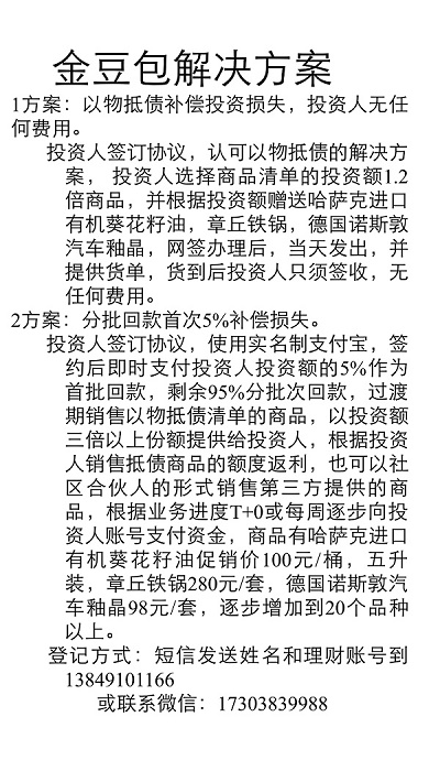 凡是第三方联系你,一律不要搭理,不会是什么好事,绝对坑。如果不信你可以加他看清楚所发协议内容,目前第三方在搞的所谓的”分期付款”,实际上是以你借出去的血汗钱总额的5%骗你的债权,剩下的95%接受协议的人必须让卖他们的垃 圾才能拿回来。骗子有专业的法律顾问,所以某些想跟骗子耍小聪明打算拿一点是一点,拿到钱再WQ,先掂量下自己有没有高狗团伙懂法再说,掂量下自己再去看值不值得为这个5%风险!我个人建议不要上当,但我也没能力阻止任何人做任何决定,债权是你自己的,好自为之!据目前所得消息搞兑换是高狗哥哥指示的,骗子不是没钱,就是不想轻易吐出来,他们就想利用第三方骗我们的债权,慢慢的耗着瓦解我们。只要我们不接受,高狗在监狱里,咱们耗得起,耗到他狗急跳墙!适当的时候我们再一起给司法施加压力,把这些狗 日的诈骗份子一锅端了!希望老天有眼!大家齐心协力!坚持到底不放弃!如果还有人追着你给你兑东西,说给你减少损失,你难道还不清楚现在的形式?你可以这么跟他说,现在的形式是高狗在牢 里享福,你这条狗天天追着我来给我送钱,犯贱!然后拉黑他!
