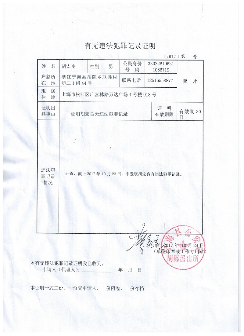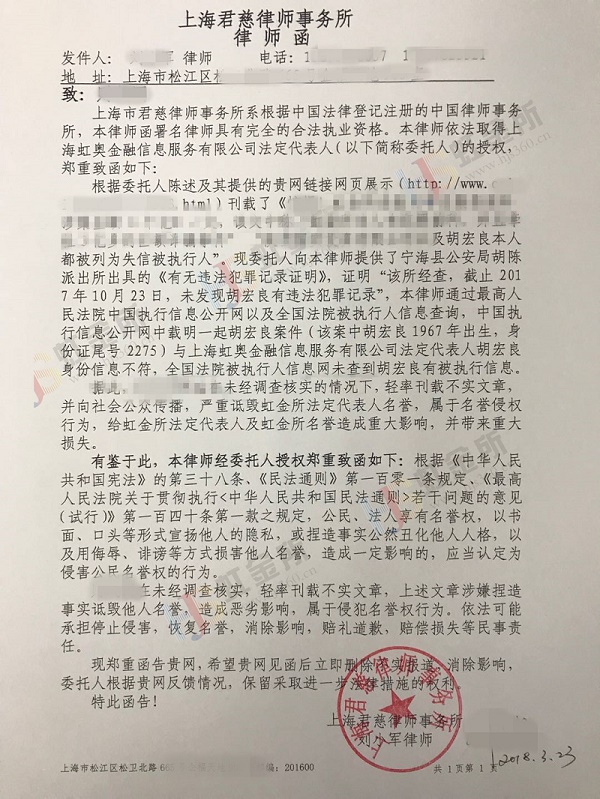 虹金所是由上海虹奥金融信息服务有限公司(注册地:上海自贸区,注册资金:一亿五百万)负责建设和运营的唯一一家创新型在线金融信息服务平台,与其他平台无任何关联;我司法人胡宏良一直以来坚持合法经营,无任何违法犯罪行为记录(详情请见附件一中公安部门出具的无犯罪记录证明);此前我司曾委托上海君慈律师事务所通过最高人民法院中国执行信息公开网及全国法院被执行人信息查询,我司法人无任何被执行记录(详情请见附件二律师所出具的律师函)。