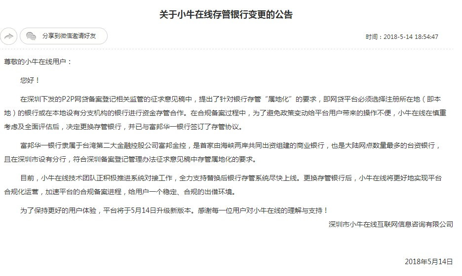 小牛网络又开始异常了,怎么回事啊······小牛在线在慎重考虑及全面评估后,决定更换存管银行,并已与富邦华一银行签订了存管协议······小牛在线 2018.5.15-8:14