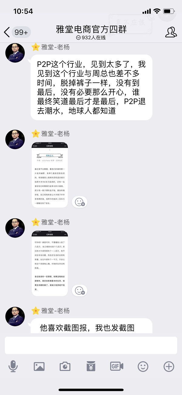 P2P这个行业,见到太多了,我见到这个行业于周总也差不多时间,脱掉裤子一样,P2P退去潮水,地球人都知道······两个残疾人朋友在公司呆了一个多月时间,离开的时候都没有拿到一分钱······狗日的就知道花钱不知道挣钱······20多亿都没发展起来。现在还谈什么发展······雅堂金融(资金盘) 2018.5.16-12:30