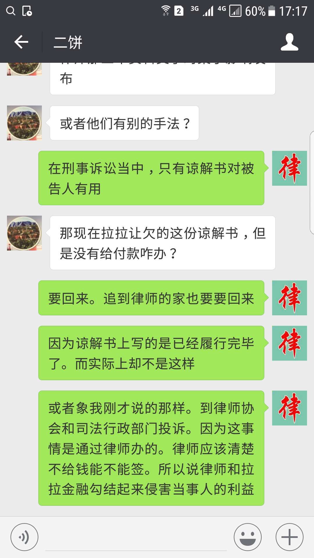 找几个托带一下节奏,然后大家一窝蜂签协议,回上几个人做做面子活。后面的大部队全部不兑付,但大部分人又签了协议,结果呵呵了······确实是回款了,我已经拿到钱了,在回家的路上······本来打算骗几张谅解书,怎猜到随随便便几百张到手······我就是那早上拿到钱之后才走的,后面的情况我就不太清楚了,因为我有朋友排在后面,我都是现在问他的······拉拉财富 2018.5.17-19:55