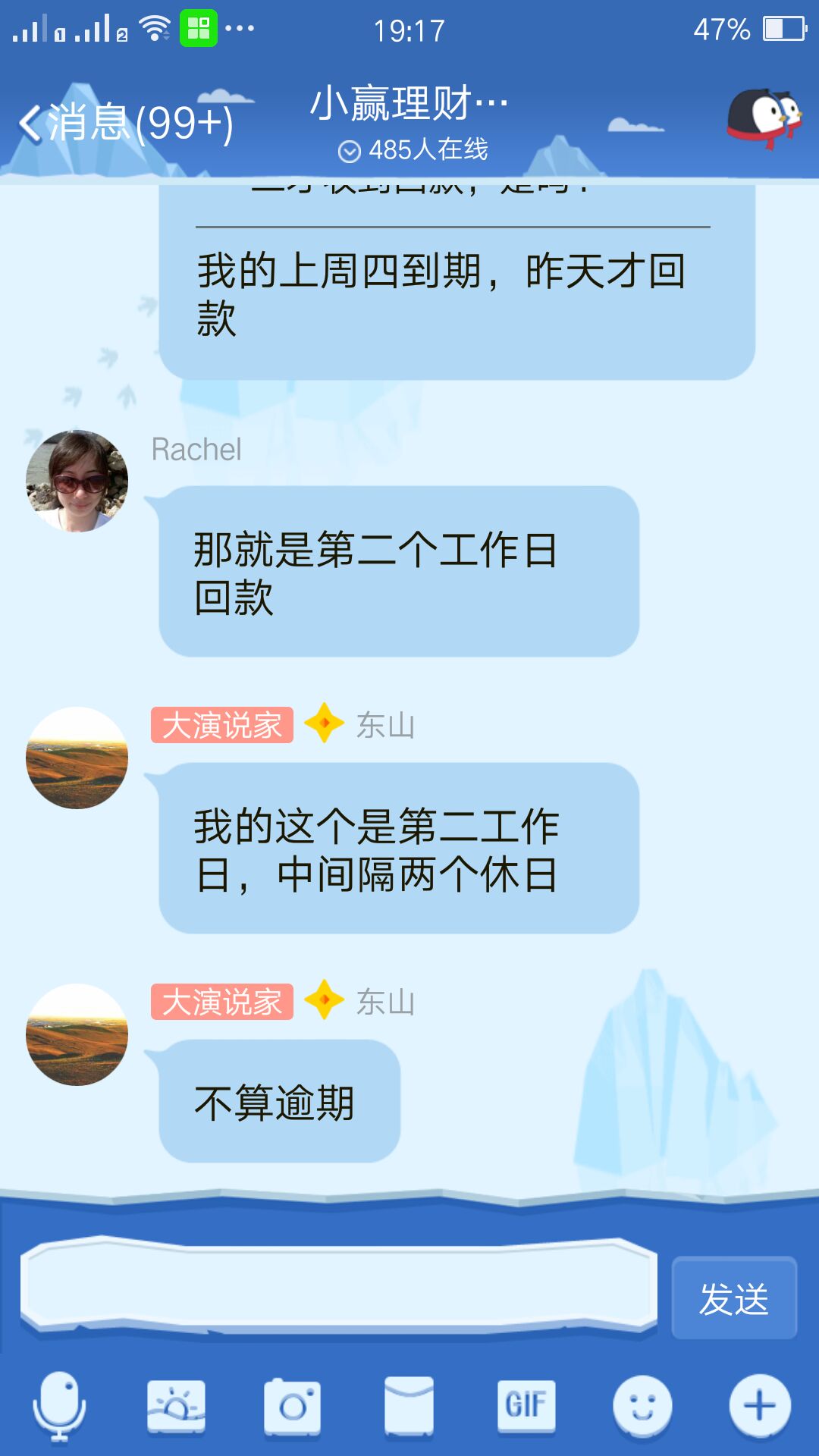 我这边有朋友去现场路上······有其他群说25号今天都没到的······现在还分鸡毛到不到期······我是不愿意相信,可信贷雷了······我也没法相信可信贷能雷······能去现场的不反对你们,希望去了就去了,拿钱就走人,不用非大肆宣扬搞死别人。也许本来可以不雷的······我的命好苦啊······各位说说是啥情况啊?我他妈的2号才上车······情况不明朗,本来没事,却被自己人黑死了,你们说难受不难受······撸高返的都还比这安全下车,什么世道······官网的公告说大规模挤兑…我只是到期提现。哪里挤兑了······以他踩雷经验说,这种情况,我们投资者最好不要恐慌,一个平台雷声出来不会一下子没掉的,现在只是逾期,如果我们越宣传负面,在车上的越惨······投的时候也知道是假标,但是意料之外可信贷不会这么傻吧,不会玩还学别人发假标······可信贷 2018.5.29-20:02