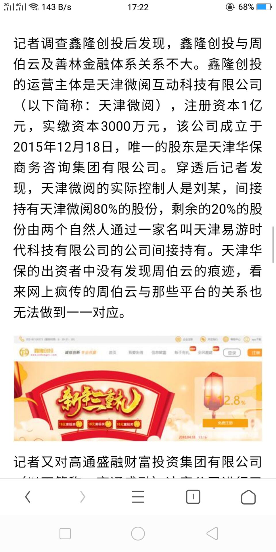 鑫隆创投还没封掉吗?也是周伯云的项目啊······都是周伯云控的盘子,没有哪个属于哪个······周伯云通过代持股的方式养活了很多投资公司,也把钱都转出去了······鑫隆创投肯定会爆,短期内就会爆。没有不暴雷的理由,输血的通道已经断了,他自己没有造血能力······鑫隆创投的客户和老周的合影,笑的开心不······你们是保安大爷的精神支柱······鑫隆创投 2018.6.4-17:58