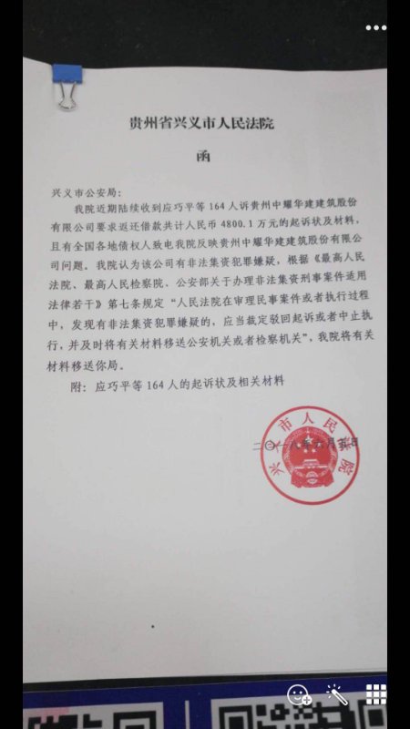 善林金融 2018.6.9-23:55······人民法院在审理民事案件或者执行过程中,发现有非法集资犯罪嫌疑的,应当裁定驳回起诉或者中止执行,并及时将有关材料移送公安机关或者检察机关······我院近期陆续收到应巧平等164人诉贵州中耀华建建筑股份有限公司要求返还借款共计人民币4800.1万元的起诉状及材料,我院将有关材料移送你局