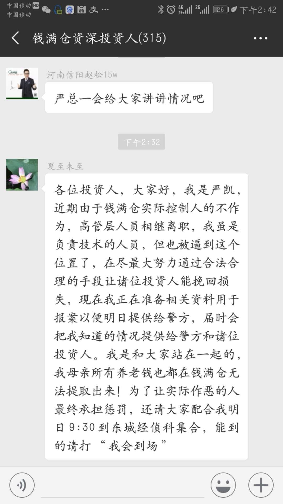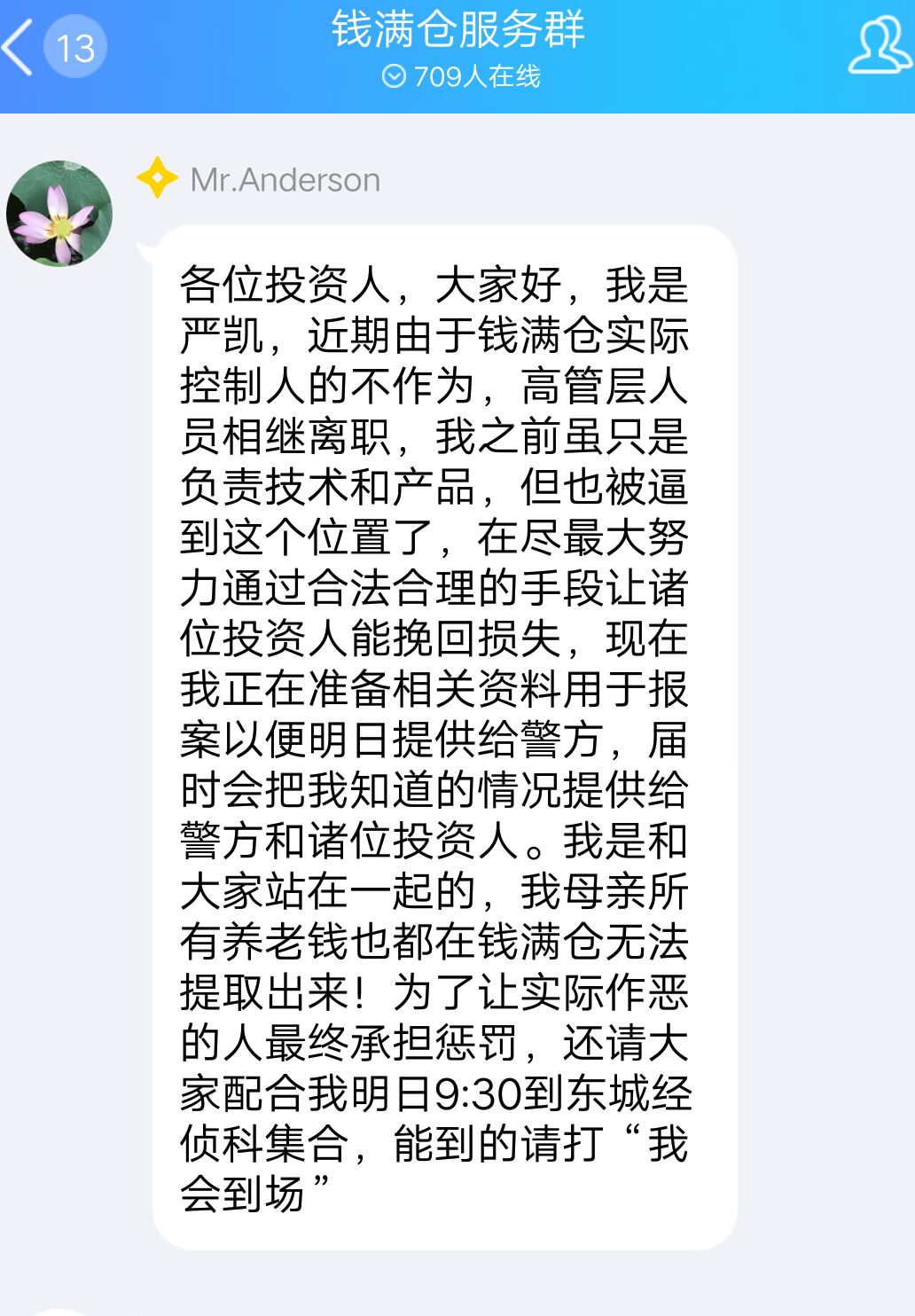 钱满仓 2018.6.15-15:34······严凯在钱满仓群里发的消息······近期由于钱满仓实际控制人的不作为,高管层相继离职,我也被逼到这个位置了······在洗白自己吧······这种情况估计钱是要不回来了
