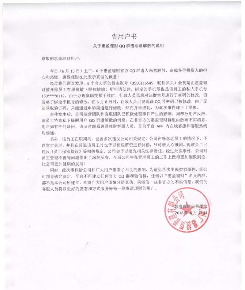 惠盈理财 2018.6.15-16:46······顿时办公室N脸懵逼······原来是被之前被开除的客服“敏敏”,亲手毁掉了我们辛苦建立的客户交流群,减少了我们和各位小主交流互动的通道······想了想费敏女士的这些所作所为,再结合本次的事件,最后小编只剩下了万分的悲痛和委屈······小编表示心疼各位一辈子,同时对此次发生的问题,向各位小主道歉,最后附上关于本次事件的官方告用户书
