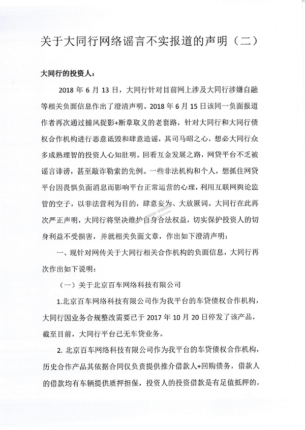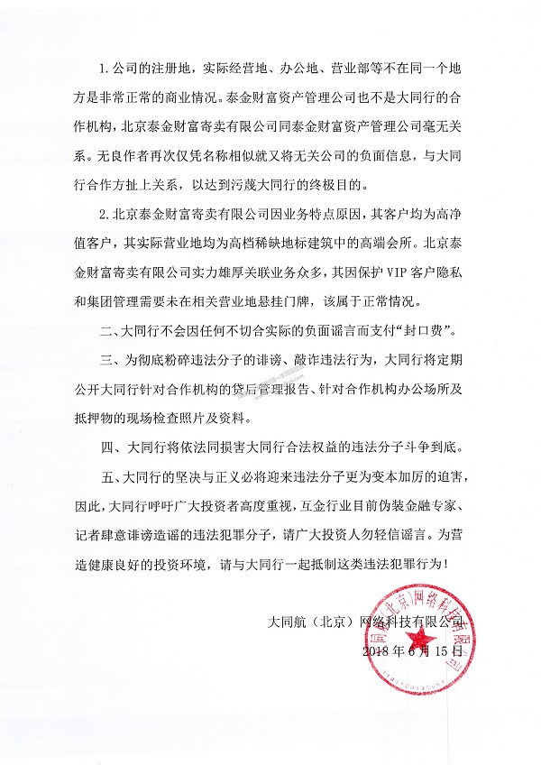2018年6月13日,大同行针对目前网上涉及大同行涉嫌自融等相关负面信息作出了澄清声明。2018年6月15日该同一负面报道作者再次通过捕风捉影+断章取义的老套路,针对大同行和大同行债权合作机构进行恶意诋毁和肆意造谣,其司马昭之心,想必大同行众多成熟理智的投资人心知肚明。大同行在此声明: