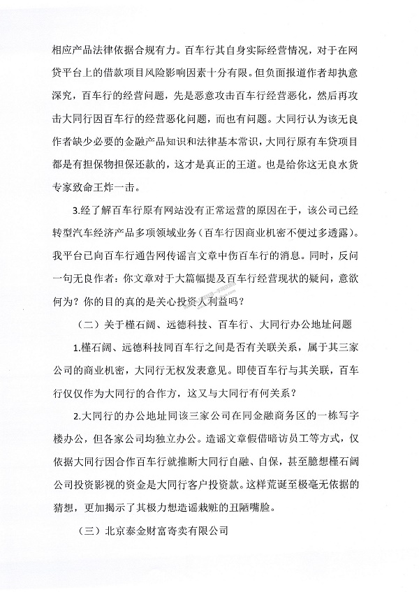 大同行 2018.6.15-22:22······这样荒诞至极毫无依据的猜想,更加揭示了其极力想造谣栽赃的丑陋嘴脸······以达到污蔑大同行的终极目的······大同行针对目前网上涉及大同行涉嫌自融等相关负面信息作出了澄清声明。2018年6月15日该同一负面报道作者再次通过捕风捉影+断章取义的老套路,针对大同行和大同行债权合作机构进行恶意诋毁和肆意造谣,其司马昭之心,想必大同行众多成熟理智的投资人心知肚明······为彻底粉碎违法分子的诽谤、敲诈违法行为,大同行将定期公开大同行针对合作机构的贷后管理报告、针对合作机构办公场所及抵押物的现场检查照片及资料