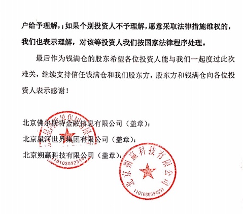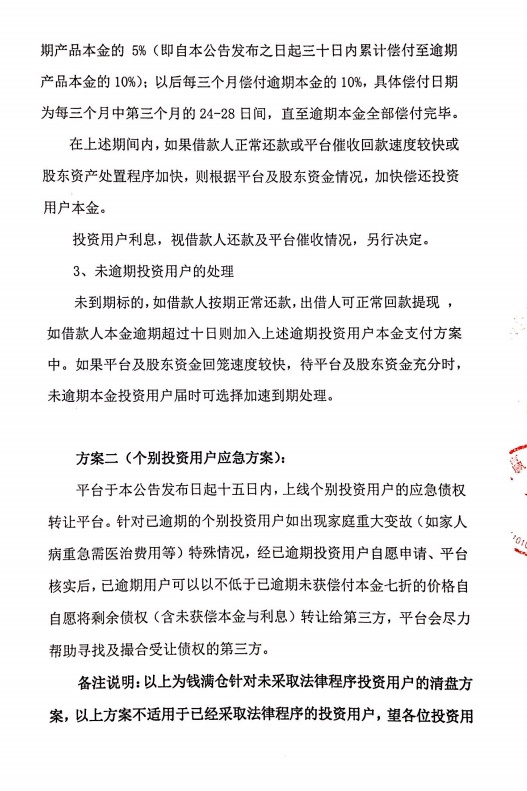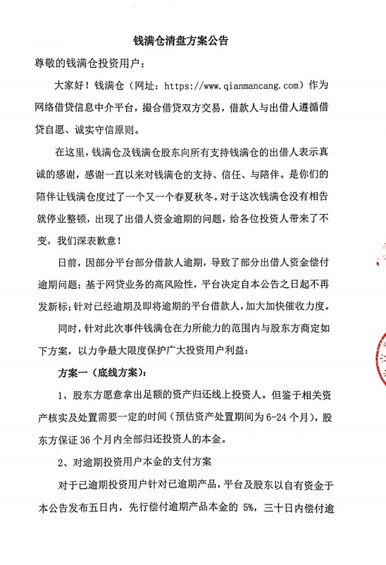 钱满仓 2018.6.19-13:59······钱满仓清盘方案公告······股东方保证36个月内归还投资人本金