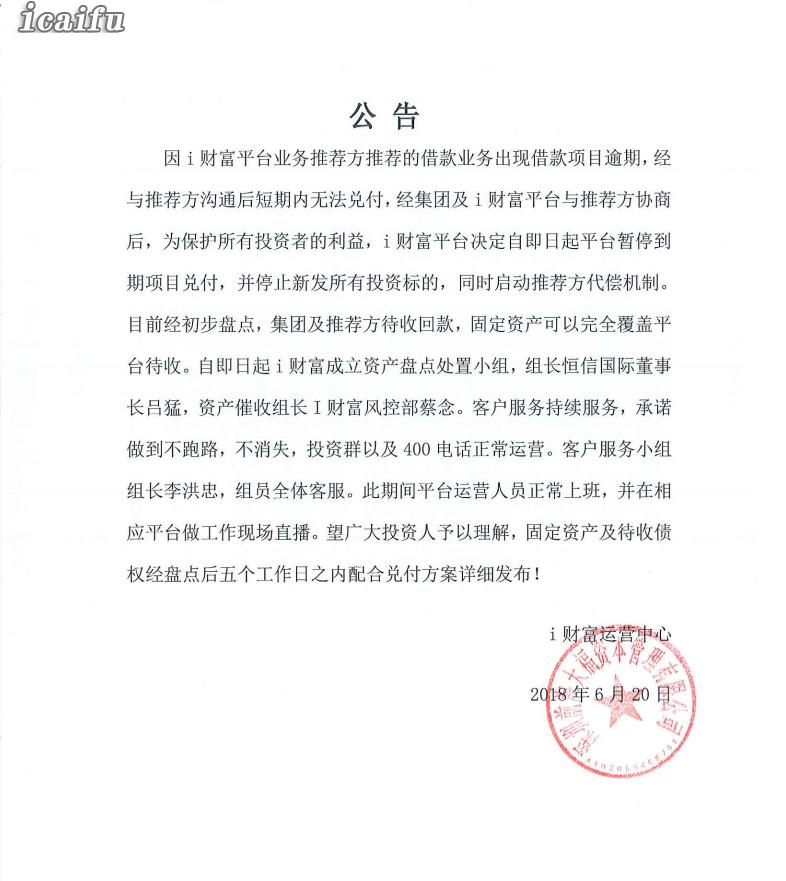 i财富 2018.6.20-15:22······i财富借款项目逾期,短期内无法兑付,决定自即日起平台暂停到期项目兑付,并停止新发投资标的······五个工作日内发布详细清盘方案······i财富荣获“2018中国金融企业诚信榜”三大奖项······作为P2P行业诚信标杆,i财富自成立之日起以诚信立本,坚持规范运营,拥抱合规,为广大投资人提供优质安全的理财服务,本次一口气囊括了榜单三项大奖——“中国最佳互联网金融创新奖”“2018中国互联网金融最佳风控安全奖”“2018中国互联网金融安全示范人物”
