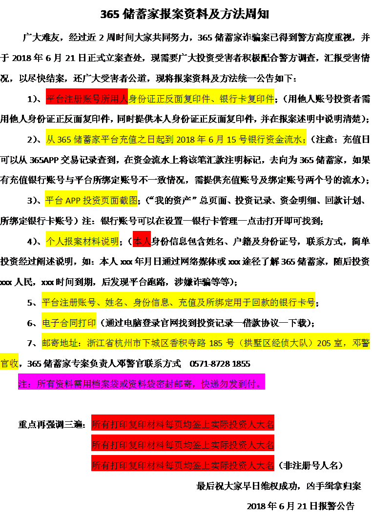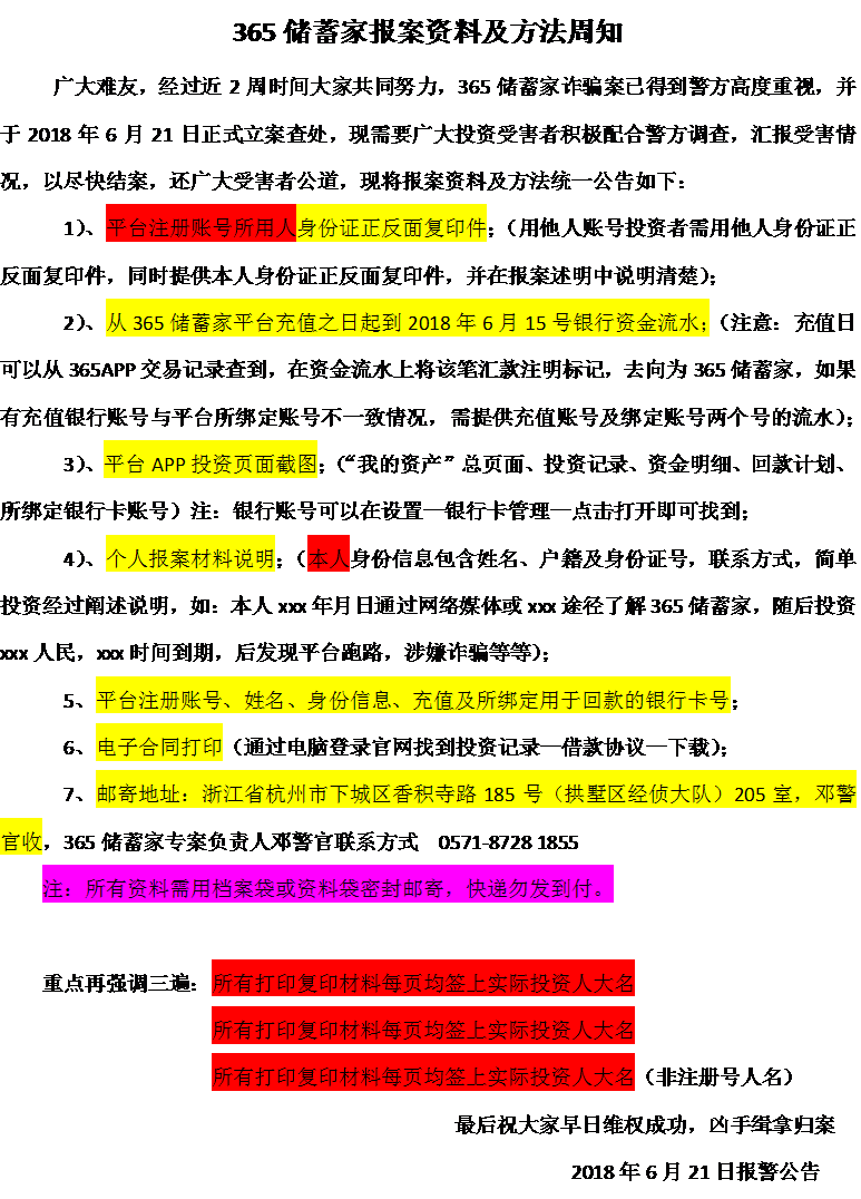 365储蓄家 2018.6.21-20:34······已经立案······大家先准备好材料外加一份手写自述。在群里等待官方的邮寄地址。回头在各自地区邮寄。然后看警方统计情况,要不停催警察施加压力······情况说明(报案材料,身份证信息,平台账号,电话,户籍地,注册账号信息,注册人,银行卡信息,)通过什么渠道知道这个,投了多少,提现多少。充值卡号,充值渠道。报案委托书不需要。用了别人的卡需要写卡主信息······我己经四个无任何回款,就连抓到平台法人和相关负责人的也石沉大海