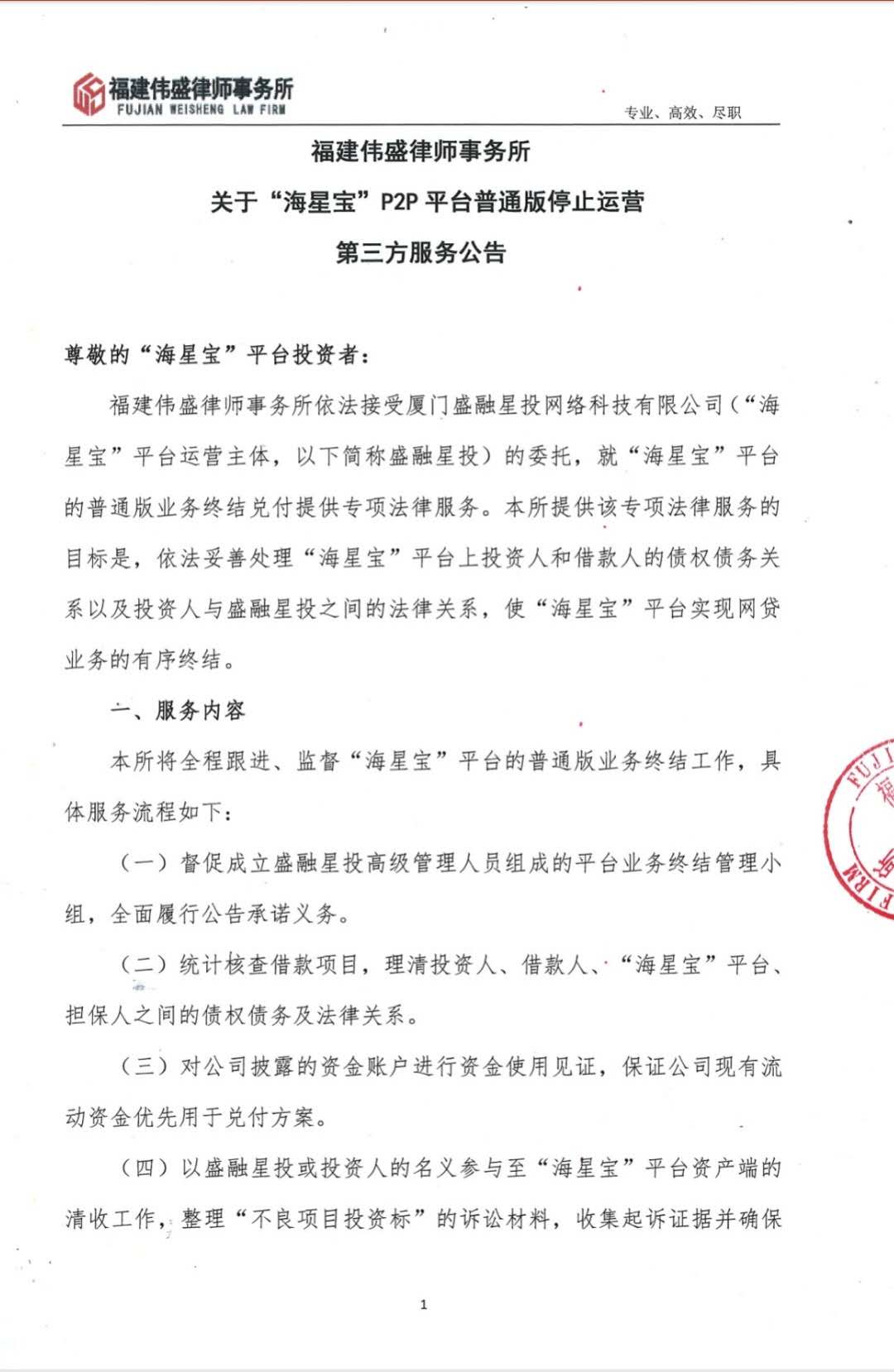 福建伟盛律师事务所关于“海星宝”P2P平台普通版停止运营第三方服务公告