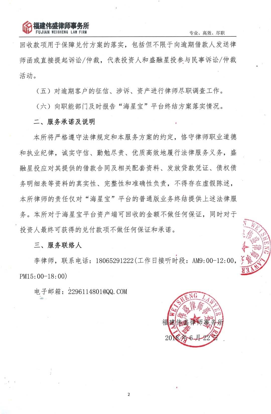 海星宝理财 2018.6.23-15:11······福建伟盛律师事务所关于“海星宝”P2P平台普通版停止运营第三方服务公告