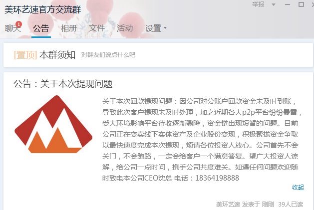 美环艺速 2018.6.25-17:23······因公司对公账户回款资金未及时到账,导致此次客户提现未及时处理,加之近期各大P2P平台纷纷暴雷,受大环境影响平台待收逐渐骤降,资金链出现短暂的问题······美环艺速登陆纳斯达克,向全球华人拜年······其实大家心里面都有数,平台到底安全不安全,能下车绝对不会再敢上的,车上一边骂着黑子一边心里慌成狗
