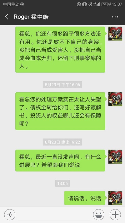 盼贷网 2018.6.25-15:56······群里的几个骨干和大户都已经兑换易创券了,我们这些人坚持留下来还有意义么?是不是只有兑换白酒这一天路了······兑换完易创的券以后就只能消费了,你和盼贷就没有任何债务关系了······我问盼贷客服,走第一条路行不行,人家说必须一个标所有的人都签那个协议才能起诉,还一直让我换易创券。所以第一条路也基本走不通了······套路太深了,给我又上了一课······只要你兑换易创券,你就等于把债务转接到易创了,所以要是到时候盼贷清盘,和你就一毛钱关系都没有了······要是你兑换了易创券,结果没有想买的东西,你的券也换不回来你在盼贷的投资债务了······按霍中皓这态度,只要不定性非吸,立马跑路。才不会去帮你打什么官司······我在易创的群里,什么路子都要看看。报案,投诉,请坚持到底,就算想把钱喂狗,也别放过坏人