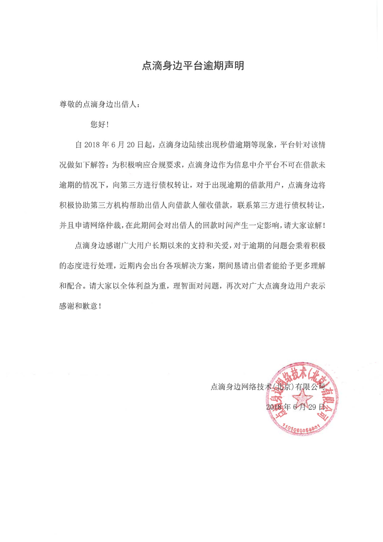 点滴身边 2018.6.29-17:11······自2018年6月20日起,点滴身边陆续出现秒借逾期等现象,平台针对该情况做如下解答:为积极响应合规要求,点滴身边作为信息中介平台不可在借款未逾期的情况下,向第三方进行债权转让,对于出现逾期的借款用户,点滴身边将积极协助第三方机构帮助出借人向借款人催收借款,联系第三方进行债权转让,并且申请网络仲裁······对于逾期的问题会秉着积极的态度进行处理,近期内会出台各项解决方案,期间恳请出借者能给予更多理解和配合。请大家以全体利益为重,理智面对问题
