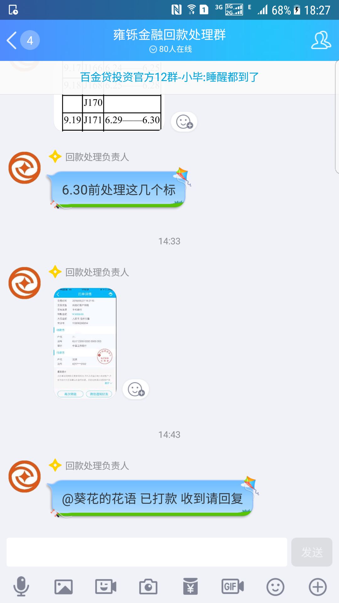 雍铄金融 2018.6.29-16:27······我的雍铄金融跑路平台昨天给我回款了······一半现金一半酒······去年九月第一个雷雍铄金融······雍铄老板主动建群要求回款······看来他那里发点财,把往事了掉······其实老板都有钱就是故意不回款······雍铄金融老板是个漂亮女子······你也是,那就别让她还了,肉偿拉倒······我是男的就不要她还了······原来你们是同类呀······可我是女的同性排斥······怎么可以不报希望呢?我回款的平台投资人可是经常给经侦和老赖电话的,我因为没有报案雍铄金融,所以我经常给老赖电话······雍铄金融跑路平台一万元酒到家