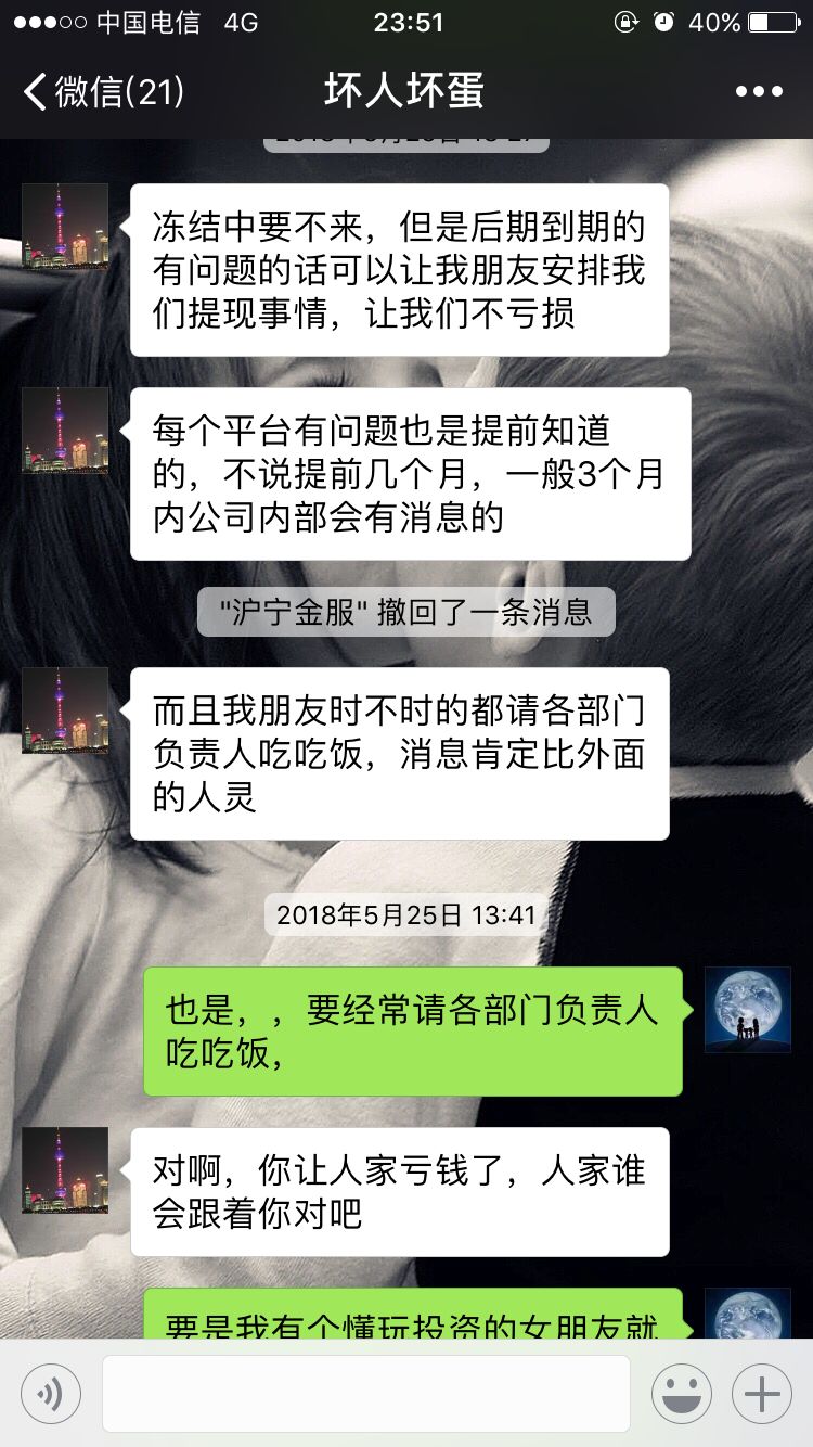 我在沪宁金服投资后聊上的,后来跟他聊天过程中(跟他学投资其他平台不会爆雷和平台出事可提前提现)不要相信他,他是骗子