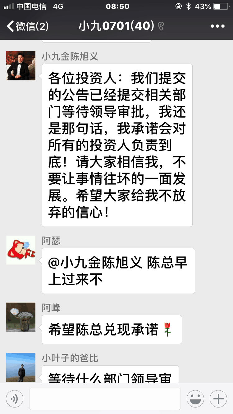 小九金服 2018.7.2-10:14······汪先生,您贵姓······小九的性质比较恶劣,刚重新看了一下,企业贷基本上是6月29号开始放的,也就是基本上都没回,额度大概3000w,非常明显的恶意,就看陈的套路了,MD······我已经家破了,就差人亡了······先等今天公告不要报警,这个是自杀,不要当猪队友,耐心等前线朋友信息······看样子大家都雷习惯了,小九不是说企业贷逾期,非的说它雷,不雷也雷了······小九这种平台说实话,实力是非常一般般的,出了问题也不第一时间处理,也许也处理不了······我居然用电脑充了两次,这么差的体验感- -我居然还是没放弃小九,想想也是后悔的要死······这台子就是扮猪吃老虎,低返,然后陈想套现走人,没想到遇到雷潮,新股东想自融来赚点钱跑路,没想到一直净流出,坚持不下去,老股东也没来得及跑路