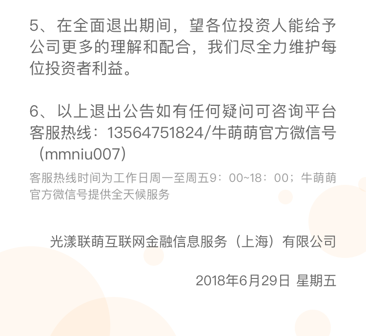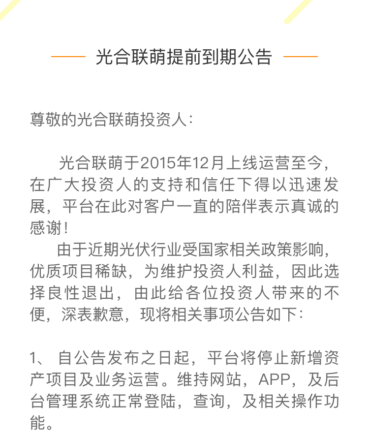 光合联萌 2018.6.29-17:24······光合联萌提前到期公告······由于近期光伏行业受国家相关政策影响,优质项目稀缺,因此选择良性退出