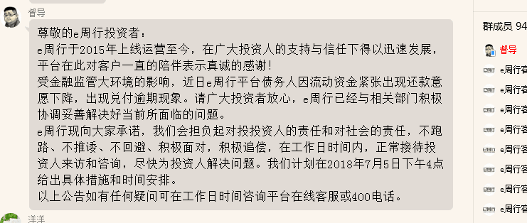 e周行 2018.7.2-23:00······e周行于2015年上线运营至今,受金融监管大环境的影响,近日e周行平台债务人因流动资金紧张出现还款意愿下降,出现兑付逾期现象。请广大投资者放心,e周行已经与相关部门积极协调妥善解决好当前所面临的问题······e周行现向大家承诺,我们会担负起对投投资人的责任和对社会的责任,不跑路、不推诿、不回避、积极面对,积极追偿