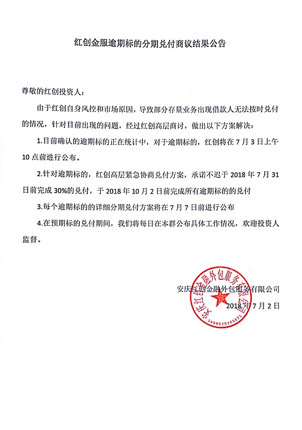 红创金服 2018.7.2-21:37······红创金服逾期标的分期兑付商议结果公告