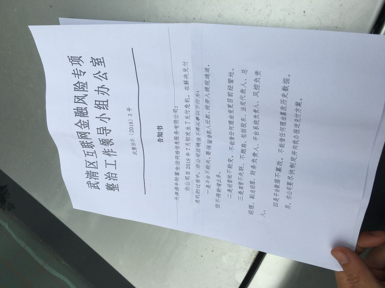 e周行 2018.7.4-12:54······武清区整治办2018(3)号告知书 你公司自2018年7月初发生了兑付危机,在解决兑付危机的过程中,你公司应确保不得从事以下行为······不关平台,不改数据······不跑路,不失联
