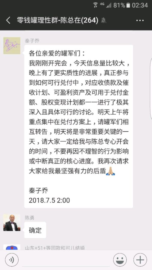 子乔和陈总一直都在积极解决问题,毕竟子乔人家是大户,为了自己更为了我们这些天一直跑前跑后,希望大家不要再不理性了,耐心等待一下,方案很快就要出了