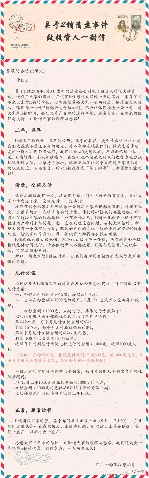 E人一铺 2018.7.5-17:37······关于E铺清盘事件致投资人一封信(内附兑付方案)······鉴于E铺2018年7月3日发布的清盘公告引起了投资人的很大的轰动,造成了大家的困扰······经过这几天E铺高管商讨清算以及结合投资人建议,特定制出以下兑付方案,全部兑付时间共分16期,每期一个月······E人一铺CEO李振鲁