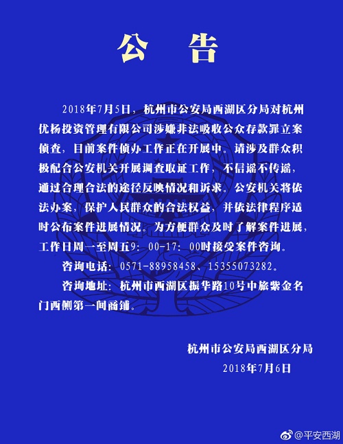佑米金融 2018.7.6-19:40······杭州市公安局西湖区分局对杭州优扬投资管理有限公司(佑米金融)涉嫌非法吸收公众存款罪立案侦查,目前案件侦办工作正在开展中