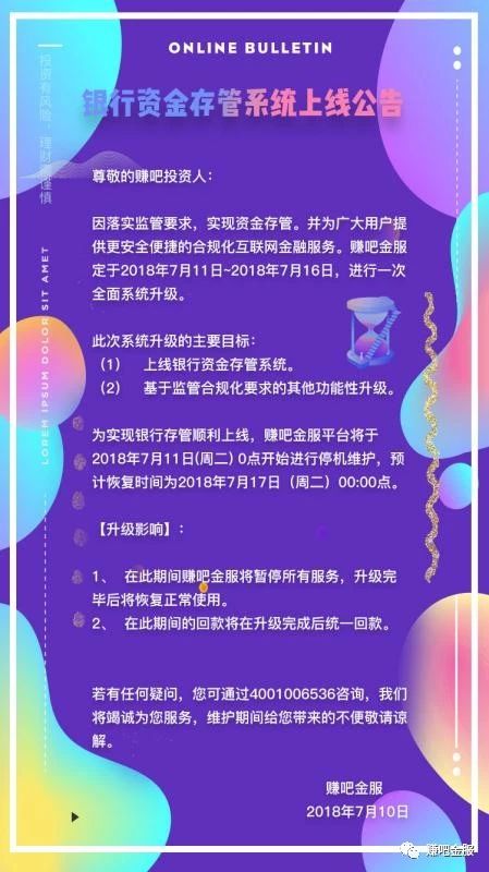 赚吧金服 2018.7.10-22:18······赚吧金服定于2018年7月11日-2018年7月16日,进行一次全面系统升级