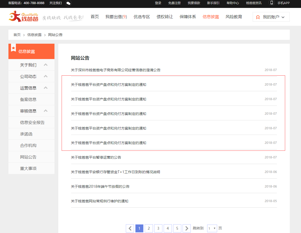 钱爸爸 2018.7.10-20:41······关于钱爸爸平台资产盘点和兑付方案制定的通知······为切实保障钱爸爸平台用户的权益,目前我们已经加大工作岗位人手配置,并在3-5个工作日内完成对平台所有资产的盘点以及统计工作。同时,我们将有计划且有序的制定兑付方案并公布······投资人如有任何问题请前往深圳市宝安中心区龙光世纪大厦12楼1206室或新设的场地深圳市福田区大中华国际金融中心A栋34楼进行咨询,亦可以通过客服热线400-788-8088和钱爸爸官方微信公众号(qian88com)与我们取得联系