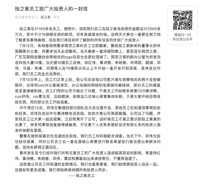 就在今日,投之家官方公众号还对外发布投之家员工致广大投资人的一封信,在该信中投之家称员工投之家总计100多名员工,据统计,目前我们员工在投之家自投资的金额总计2000多万元,其中不少为结婚买房的款项,还有亲戚朋友的钱。