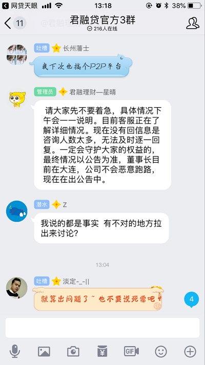 君融理财(君融贷) 2018.7.15-13:44……客服都说逾期了,这个就别怀疑了……又被黑子拿下一个平台……现在好怕被挤死……看到这个,心都死一半……前两天才雷了一个,还没走出来……这中午又没法睡了……请大家先不要着急,具体情况下午会一一说明,董事长目前在大连,公司不会恶意跑路,现在在出公告中