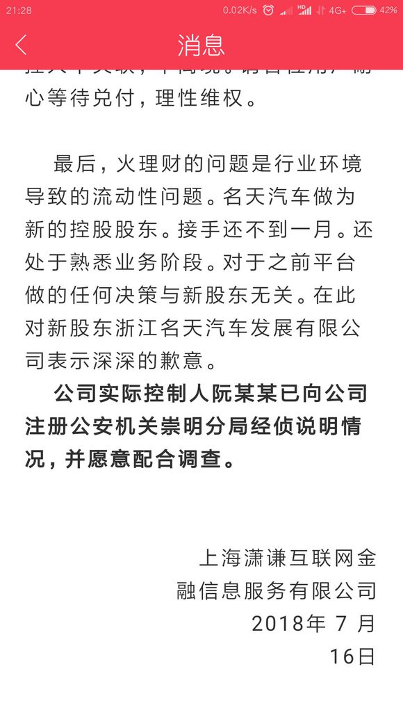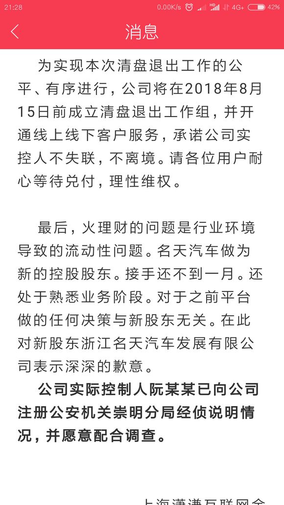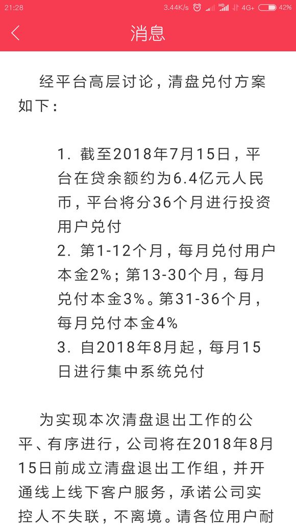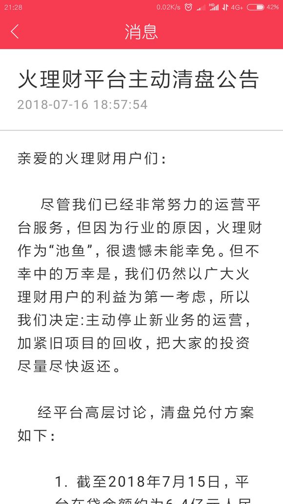 火理财 2018.7.16-18:58……火理财平台主动清盘公告……因为行业的原因,火理财作为“池鱼”,很遗憾未能幸免。但不幸中的万幸是,我们决定,主动停止新业务运营,清盘兑付方案如下