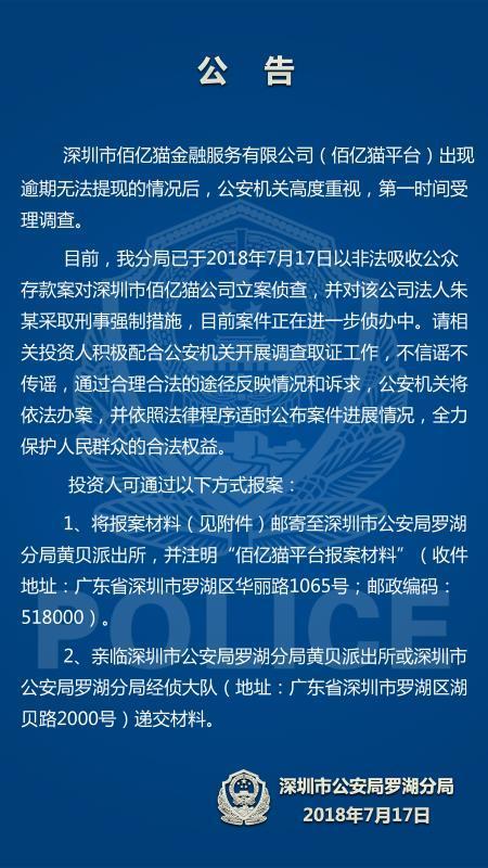 佰亿猫 2018.7.17-21:35……深圳市佰亿猫金融服务有限公司(佰亿猫平台)出现逾期无法提现的情况……我分局已于2018年7月17日以非法吸收公众存款案对深圳市佰亿猫公司立案侦查,并对该公司法人朱某采取刑事强制措施……将报案材料(见附件)邮寄至深圳市公安局罗湖分局黄贝派出所……亲临深圳市公安局罗湖分局黄贝派出所或深圳市公安局罗湖分局经侦大队