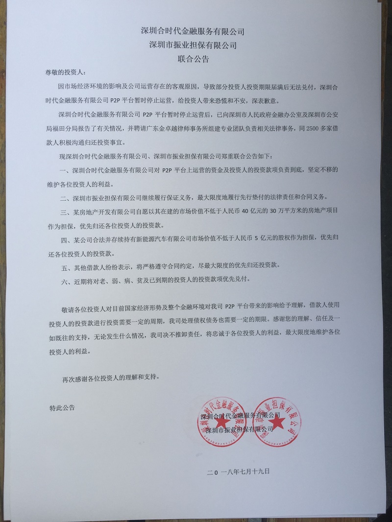 合时代 2018.7.19-14:33……深圳合时代金融服务有限公司、深圳市振业担保有限公司联合公告……深圳合时代金融服务有限公司P2P平台暂时停止运营后,已向深圳市人民政府金融办公室及深圳市公安局福田分局报告了有关情况,并聘请广东金卓越律师事务所组建专业团队负责相关法律事务,同2500多家借款人积极沟通归还投资事宜……敬请各位投资人对目前国家经济形势及整个金融环境对我司P2P平台带来的影响给予理解,借款人使用投资人的投资款进行投资需要一定的周期,我司处理债权债务也需要一定的期限